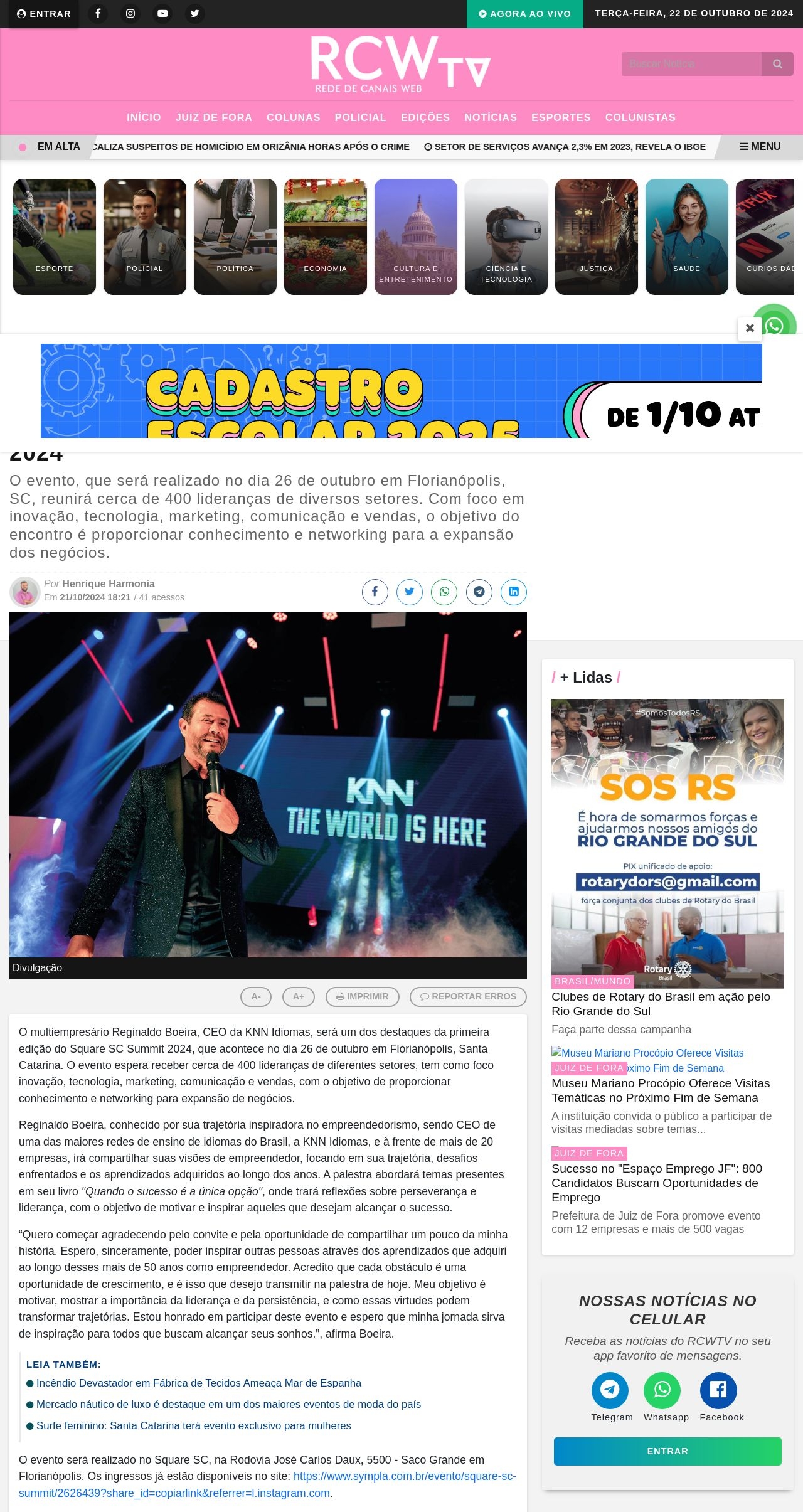 CEO da KNN Idiomas, Reginaldo Boeira, palestra sobre liderança e empreendedorismo no Square SC Summit 2024 - RCWTV
